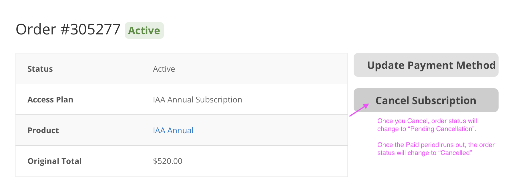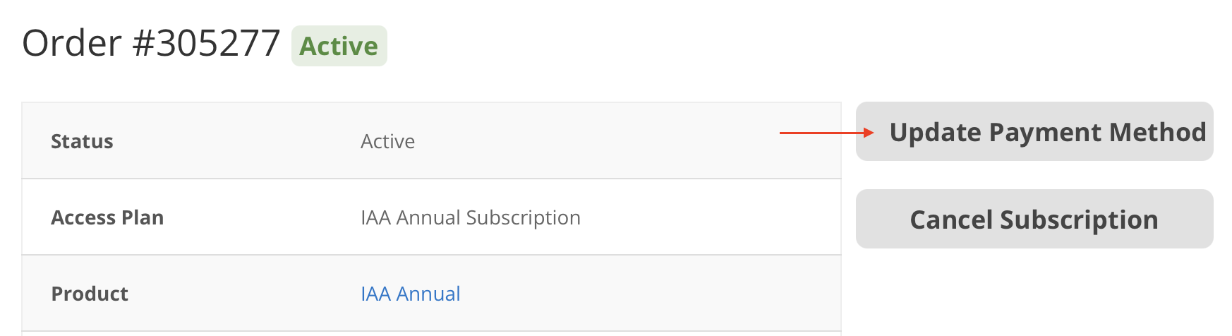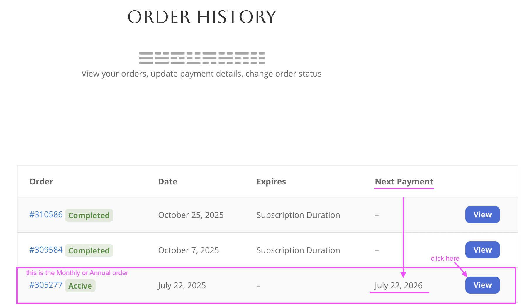 On the Order History page, find on the list your IAA Monthly or IAA Annual order. It’ll be the order where there is a date written under the “Next Payment” column, usually at the bottom of the list, see image below